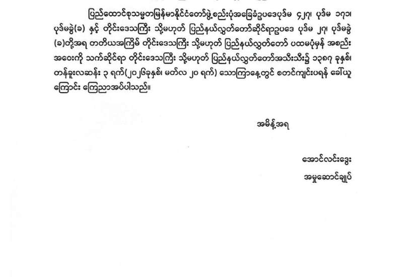 တတိယအကြိမ် ပြည်သူ့လွှတ်တော် ပထမပုံမှန်အစည်းအဝေးတက်ရောက်ရန်အတွက် ပြည်သူ့လွှတ်တော်ကိုယ်စားလှယ်များ သတင်းပို့ကြရန် ပြည်သူ့လွှတ်တော်ထုတ်ပြန်