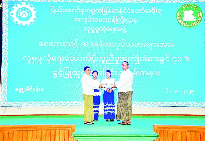 ပြည်ထောင်စုနယ်မြေအတွင်း အကျုံးဝင်မှတ်ပုံတင်ထားသော အလုပ်ဌာနများမှ ရေဘေးသင့်အာမခံအလုပ်သမားများအား လူမှုဖူလုံရေးထောက်ပံ့ကူညီမှု အကျိုးခံစားခွင့် ၄၀ ရာခိုင်နှုန်း ခွင့်ပြုထုတ်ပေးရန် နေပြည်တော်ကောင်စီဥက္ကဋ္ဌထံ ပေးအပ်ခြင်းအခမ်းအနားကို ယနေ့နံနက်ပိုင်းတွင် နေပြည်တော်ကောင်စီ ဇမ္ဗူသီရိခန်းမ၌ ကျင်းပသည်။