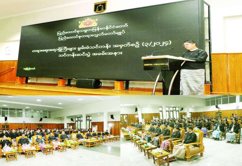 တရားရေးအရာရှိကြီးများမွမ်းမံသင်တန်း အမှတ်စဉ် (၃/၂၀၂၄) သင်တန်း ဆင်းပွဲ အခမ်းအနားကို ဒီဇင်ဘာ ၂၇ ရက် နံနက်ပိုင်းက ပြည်ထောင်စုတရားလွှတ်တော်ချုပ် Judicial College ၌ကျင်းပရာ ပြည်ထောင်စုတရားသူကြီးချုပ် ဦးသာဌေးတက်ရောက်၍ သင်တန်းဆင်းအမှာစကားပြောကြားသည်။