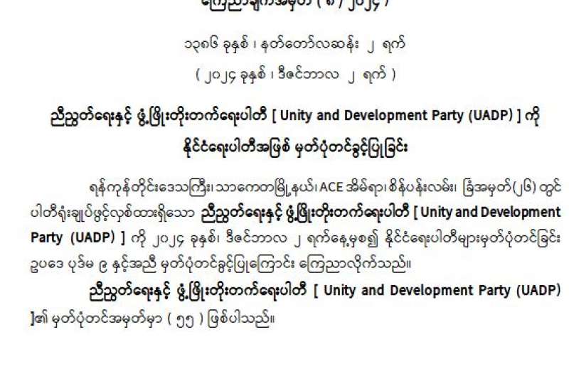 ညီညွတ်ရေးနှင့် ဖွံ့ဖြိုးတိုးတက်ရေးပါတီ [ Unity and Development Party (UADP) ] ကို နိုင်ငံရေးပါတီအဖြစ် မှတ်ပုံတင်ခွင့်ပြုခြင်း