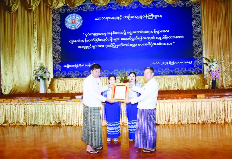 ပုဂံရှေးဟောင်းယဉ်ကျေးမှုအမွေအနှစ်ဒေသအတွင်း ရေကြီးရေလျှံမှုများ ထပ်မံမဖြစ်ပေါ်စေရေးနှင့် ရေစီးရေလာကောင်းမွန်စေရေးအတွက် ရေလမ်းကြောင်းများဖော်ထုတ်ခြင်းနှင့် ရှေးဟောင်းရေကန် ၉၁ ကန်အား ပြန်လည်တူးဖော်ထိန်းသိမ်းကန်ဆယ်ခြင်းလုပ်ငန်းများကို ဆောင်ရွက်နိုင်ရန် ဝိုင်းဝန်းကူညီဆောင်ရွက်ပေးကြသည့် ဝန်ကြီးဌာနများနှင့် ရေကန်အလှူရှင်များအား ဂုဏ်ပြုမှတ်တမ်းလွှာပေးအပ်ပွဲအခမ်းအနားကို ယနေ့တွင် အမျိုးသားပြတိုက် (ရန်ကုန်) ဘက်စုံခန်းမ၌ ကျင်းပရာ သာသနာရေးနှင့်ယဉ်ကျေးမှုဝန်ကြီးဌာန ပြည်ထောင်စုဝန်ကြီး ဦးတင်ဦးလွင်၊ ရန်ကုန်တိုင်းဒေသကြီးဝန်ကြီးများနှင့် တာဝန်ရှိသူများ၊ ရေကန်အလှူရှင်များ တက်ရောက်ကြသည်။