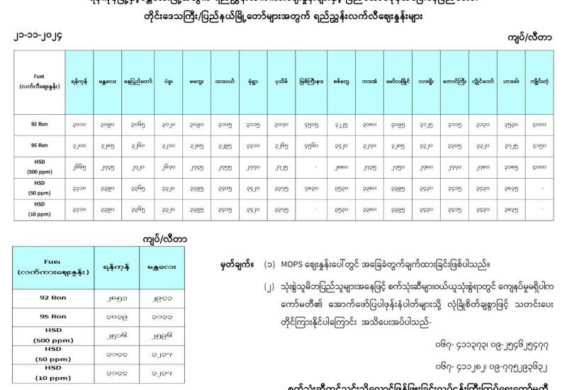 ရန်ကုန်မြို့နှင့် မန္တလေးမြို့အတွက် ရည်ညွှန်းလက်ကားဈေးနှုန်းများနှင့် ပြည်ထောင်စုနယ်မြေ နေပြည်တော်၊ တိုင်းဒေသကြီး/ ပြည်နယ် မြို့တော်များအတွက် ရည်ညွှန်းလက်လီဈေးနှုန်းများ