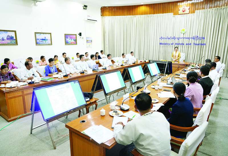 ဟိုတယ်နှင့် ခရီးသွားကဏ္ဍအတွက် လိုအပ်သည့် လူ့စွမ်းအားအရင်းအမြစ်များ ပြုစုပျိုးထောင်မွေးထုတ်နိုင်ရေးအတွက် နိုင်ငံအဆင့် ဟိုတယ်နှင့်ခရီးသွားလုပ်ငန်းဆိုင်ရာ သက်မွေးသင်တန်းကျောင်း တည်ထောင်နိုင်ရေးအကြို ညိနှိုင်းအစည်းအဝေးကို ယနေ့နံနက်ပိုင်းတွင် ဟိုတယ်နှင့် ခရီးသွားလာရေးဝန်ကြီးဌာန နီလာခန်းမ၌ ကျင်းပသည်။
