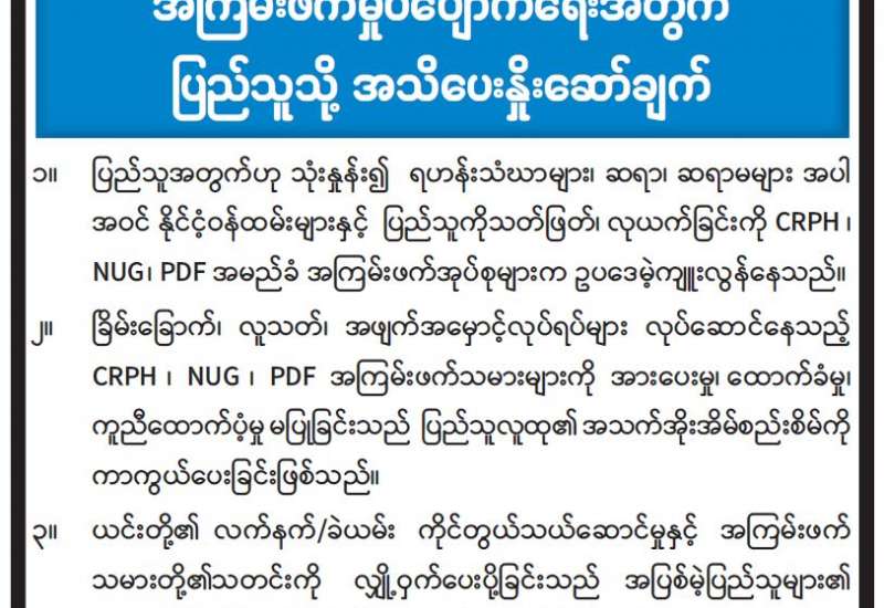 အကြမ်းဖက်မှုပပျောက်ရေးအတွက် ပြည်သူသို့ အသိပေးနှိုးဆော်ချက်