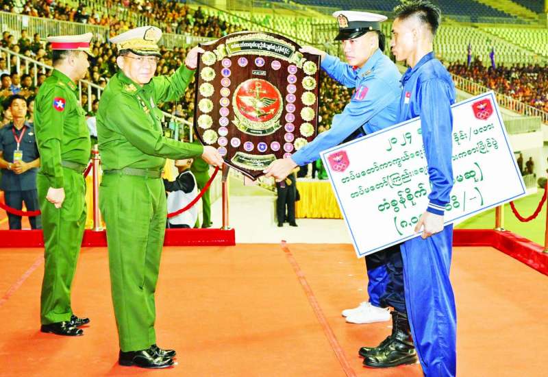 ၂၀၂၄ ခုနှစ်၊ တပ်မတော် (ကြည်း၊ ရေ၊ လေ) အားကစားပြိုင်ပွဲ ဆုချီးမြှင့်ပွဲ အခမ်းအနားကို ယနေ့ညနေပိုင်းတွင် နေပြည်တော်ရှိ ဇေယျာသီရိတပ်မတော်အားကစားကွင်း၌ ကျင်းပပြုလုပ်ရာ နိုင်ငံတော်စီမံအုပ်ချုပ်ရေးကောင်စီဥက္ကဋ္ဌ တပ်မတော်ကာကွယ်ရေးဦးစီးချုပ် ဗိုလ်ချုပ်မှူးကြီး မင်းအောင်လှိုင် တက်ရောက်အားပေးပြီး ဆုများပေးအပ်ချီးမြှင့်သည်။