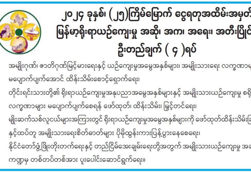 ပြီးခဲ့သည့်လအတွင်းက တိုင်ဖွန်းမုန်တိုင်း “ရာဂီ” ၏အရှိန်သက်ရောက်မှုကြောင့် ရေကြီးရေလျှံသဘာဝဘေးအန္တရာယ်များ မြန်မာနိုင်ငံတစ်ဝန်း၌ ကြီးကြီးမားမား ကြုံတွေ့ခံစားခဲ့ကြရသည်။ သဘာဝဘေးအန္တရာယ် ကျရောက်ခဲ့သည့်ဒေသများတွင် ကယ်ဆယ်ရေးနှင့် ပြန်လည်ထူထောင်ရေးလုပ်ငန်းများကို နိုင်ငံတော်အစိုးရနှင့်အတူ အဖွဲ့အစည်းများ၊ လူမှုရေးအသင်းအဖွဲ့များ၊ စေတနာရှင်များ၊ ပြည်သူများက အလျင်အမြန် တစ်တပ်တစ်အား ကူညီဆောင်ရွက်ပေးလျက်ရှိသည်။