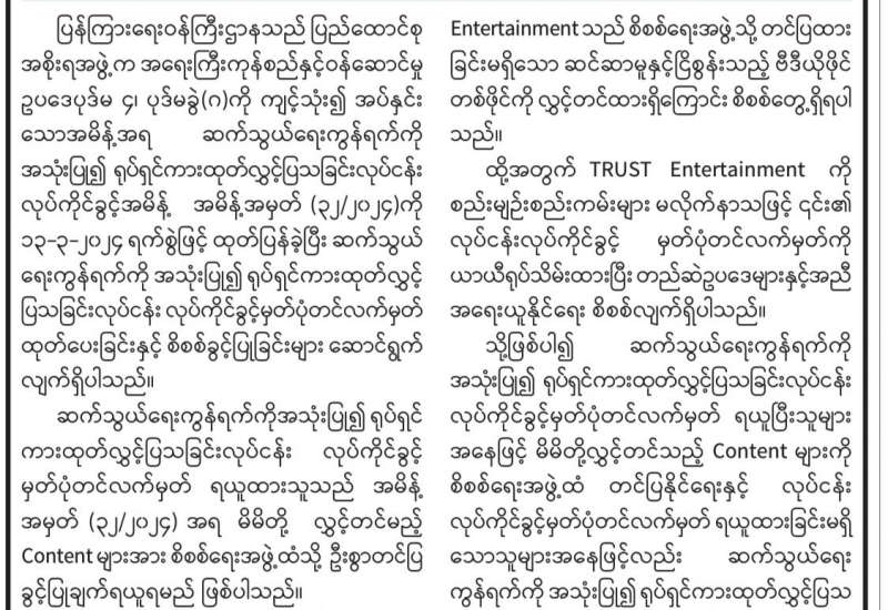 ပြန်ကြားရေးဝန်ကြီးဌာနသည် ပြည်ထောင်စုအစိုးရအဖွဲ့က အရေးကြီးကုန်စည်နှင့်ဝန်ဆောင်မှု ဥပဒေပုဒ်မ ၄၊ ပုဒ်မခွဲ(ဂ)ကို ကျင့်သုံး၍ အပ်နှင်းသောအမိန့်အရ ဆက်သွယ်ရေးကွန်ရက်ကို အသုံးပြု၍ ရုပ်ရှင်ကားထုတ်လွှင့်ပြသခြင်းလုပ်ငန်း လုပ်ကိုင်ခွင့်အမိန့် အမိန့်အမှတ် (၃၂/၂၀၂၄) ကို ၁၃-၃-၂၀၂၄ ရက်စွဲဖြင့်ထုတ်ပြန်ခဲ့ပြီး ဆက်သွယ်ရေးကွန်ရက်ကိုအသုံးပြု၍ ရုပ်ရှင်ကားထုတ်လွှင့် ပြသခြင်းလုပ်ငန်း လုပ်ကိုင်ခွင့်မှတ်ပုံတင်လက်မှတ် ထုတ်ပေးခြင်းနှင့် စိစစ်ခွင့်ပြုခြင်းများ ဆောင်ရွက်လျက်ရှိပါသည်။