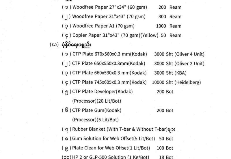 စက္ကူ နှင့် ပုံနှိပ်ရေးပစ္စည်းများဝယ်ယူရန် အိတ်ဖွင့်တင်ဒါခေါ်ယူခြင်း