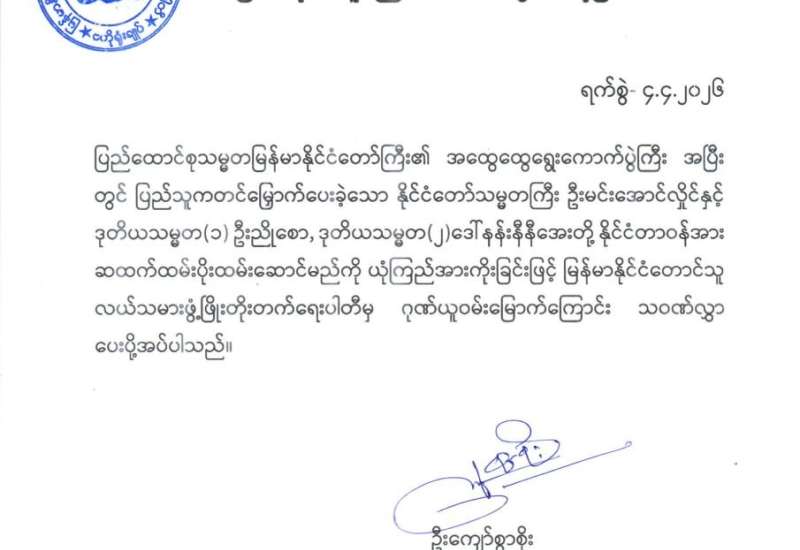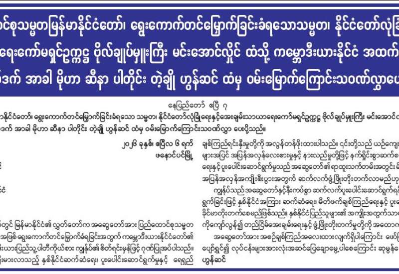 ပြည်ထောင်စုသမ္မတမြန်မာနိုင်ငံတော်၊ ရွေးကောက်တင်မြှောက်ခြင်းခံရသောသမ္မတ၊ နိုင်ငံတော်လုံခြုံရေးနှင့်အေးချမ်းသာယာရေးကော်မရှင်ဥက္ကဋ္ဌ ဗိုလ်ချုပ်မှူးကြီး မင်းအောင်လှိုင်ထံသို့ ကမ္ဘောဒီးယားနိုင်ငံ အထက်လွှတ်တော်ဥက္ကဋ္ဌ ဆမ်ဒက် အာခါ မိုဟာ ဆီနာ ပါတိုင်း တဲ့ချို ဟွန်ဆင်ထံမှ ဝမ်းမြောက်ကြောင်းသဝဏ်လွှာပေးပို့