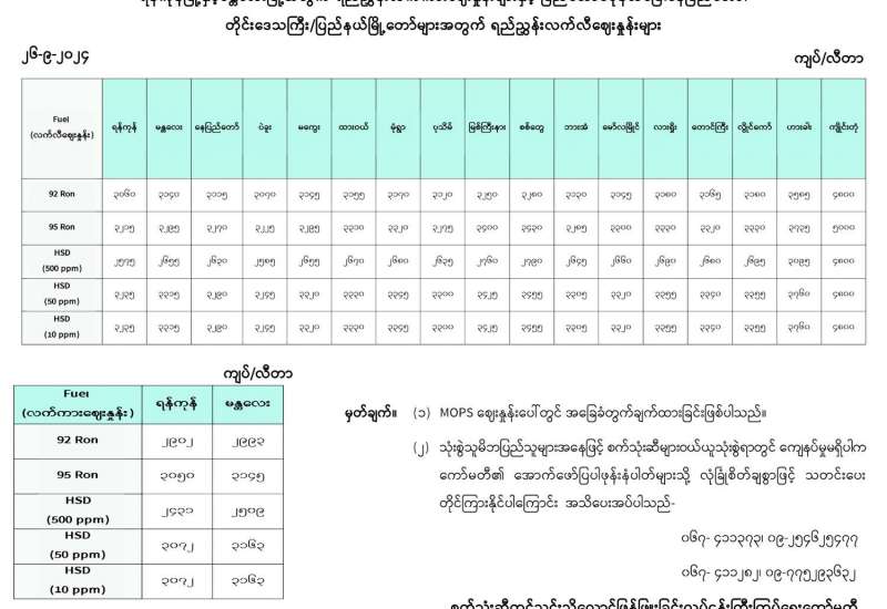 ရန်ကုန်မြို့နှင့် မန္တလေးမြို့အတွက် ရည်ညွှန်းလက်ကားဈေးနှုန်းများနှင့် ပြည်ထောင်စုနယ်မြေ နေပြည်တော်၊ တိုင်းဒေသကြီး/ပြည်နယ် မြို့တော်များအတွက် ရည်ညွှန်းလက်လီဈေးနှုန်းများ