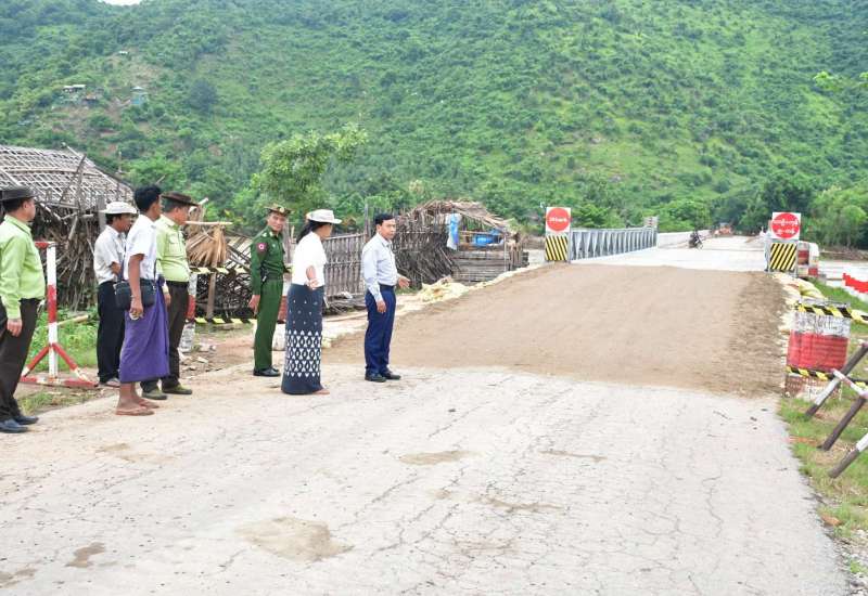ဆောက်လုပ်ရေးဝန်ကြီးဌာန ပြည်ထောင်စုဝန်ကြီး ဦးမျိုးသန့်သည် အမြဲတမ်းအတွင်းဝန်၊ ညွှန်ကြားရေးမှူးချုပ်များ၊ တာဝန်ရှိသူများနှင့်အတူ ယနေ့တွင် နေပြည်တော်ကောင်စီနယ်မြေအတွင်း သဘာဝဘေး ကြောင့်ပျက်စီးခဲ့သော လမ်း၊ တံတားများ ယာယီပြင်ဆင်ပြီးစီးမှုအခြေအနေ၊ လမ်း၊ တံတားများ၏ ကြံ့ခိုင်မှုအခြေအနေ၊ ကုန်စည်ပို့ဆောင်သည့် မော်တော်ယာဉ်များနှင့်ခရီးသည်ယာဉ်များ ဖြတ်သန်းသွားလာခွင့်ပြုထားမှုအခြေအနေနှင့် မူလအခြေအနေအတိုင်း အခိုင်အမာပြန်လည်တည်ဆောက်မည့် အခြေအနေတို့ကို ကွင်းဆင်းကြည့်ရှုစစ်ဆေးသည်။