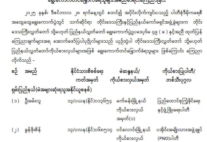 တိုင်းဒေသကြီးလွှတ်တော် သို့မဟုတ် ပြည်နယ်လွှတ်တော်ကိုယ်စားလှယ်အဖြစ် ရွေးကောက်တင်မြှောက်ခံရသူများ အမည်စာရင်းကြေညာခြင်း