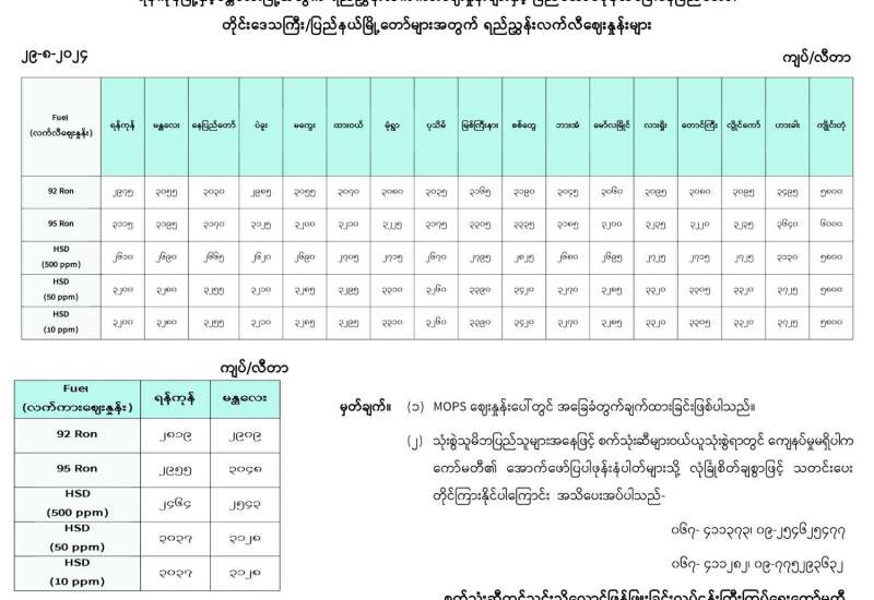 ရန်ကုန်မြို့နှင့် မန္တလေးမြို့အတွက် ရည်ညွှန်းလက်ကားဈေးနှုန်းများနှင့် ပြည်ထောင်စုနယ်မြေ နေပြည်တော်၊ တိုင်းဒေသကြီး/ပြည်နယ် မြို့တော်များအတွက် ရည်ညွှန်းလက်လီဈေးနှုန်းများ
