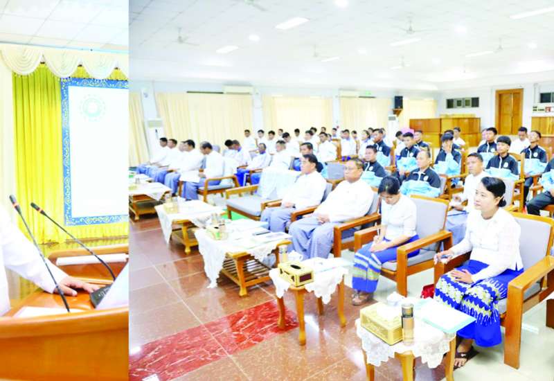 နိုင်ငံ့ဝန်ထမ်း တက္ကသိုလ် (အောက်မြန်မာပြည်) စာရေးဝန်ထမ်းကြီးကြပ်သင်တန်း အမှတ်စဉ်(၉၆) သင်တန်းဖွင့်ပွဲအခမ်းအနားကို အုန်းတောခန်းမ၌ aယနေ့နံနက် ၈ နာရီတွင် ကျင်းပရာ ဒုတိယပါမောက္ခချုပ်(စီမံ ခန့်ခွဲရေး) ဒေါ်မူမူမြင့်က သင်တန်းဖွင့်မိန့်ခွန်းပြောကြားသည်။
