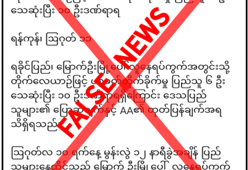 ရခိုင်ပြည်နယ်၊ မြောက်ဦးမြို့ပေါ် ရပ်ကွက်များအတွင်းသို့ ဩဂုတ်လ ၁၀ ရက်နေ့တွင် တပ်မတော်က တိုက်လေယာဉ်ဖြင့် ဗုံးကြဲတိုက်ခိုက်မှုကြောင့် ပြည်သူ ၆ ဦးသေဆုံးပြီး ၁၀ ဦး ထိခိုက်ဒဏ်ရာရရှိခဲ့သည်ဟု တရားမဝင်ပြည်ဖျက်မီဒီယာများက မဟုတ်မမှန် ရေးသားဖြန့်ဝေနေသည်ကို တွေ့ရှိရသည်။
