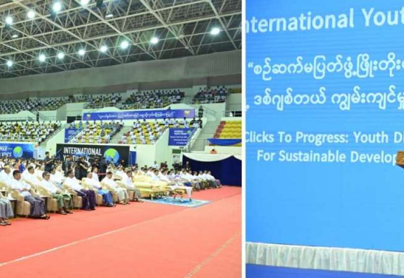 ၂၀၂၄ ခုနှစ်၊ အပြည်ပြည်ဆိုင်ရာ လူငယ်များနေ့အခမ်းအနားကို ယနေ့မွန်းလွဲပိုင်းတွင် နေပြည်တော်ရှိ ဝဏ္ဏသိဒ္ဓိအားကစားရုံ(C)၌ ကျင်းပပြုလုပ်ရာ နိုင်ငံတော်စီမံအုပ်ချုပ်ရေးကောင်စီဥက္ကဋ္ဌ နိုင်ငံတော်ဝန်ကြီးချုပ် ဗိုလ်ချုပ်မှူးကြီး မင်အောင်လှိုင် တက်ရောက်အမှာစကားပြောကြားသည်။