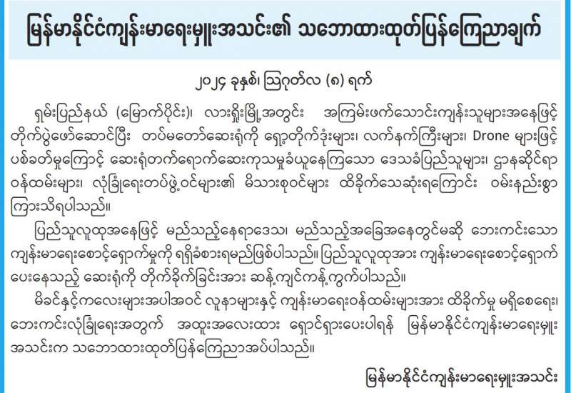 ရှမ်းပြည်နယ်(မြောက်ပိုင်း)၊ လားရှိုးမြို့အတွင်း အကြမ်းဖက်သောင်းကျန်းသူများအနေဖြင့် တိုက်ပွဲဖော်ဆောင်ပြီး တပ်မတော်ဆေးရုံကို ရှော့တိုက်ဒုံးများ၊ လက်နက်ကြီးများ၊ Drone များဖြင့် ပစ်ခတ်မှုကြောင့် ဆေးရုံတက်ရောက်ဆေးကုသမှုခံယူနေကြသော ဒေသခံပြည်သူများ၊ ဌာနဆိုင်ရာဝန်ထမ်းများ၊ လုံခြုံရေးတပ်ဖွဲ့ဝင်များ၏ မိသားစုဝင်များ ထိခိုက်သေဆုံးရကြောင်း ဝမ်းနည်းစွာကြား သိရပါသည်။