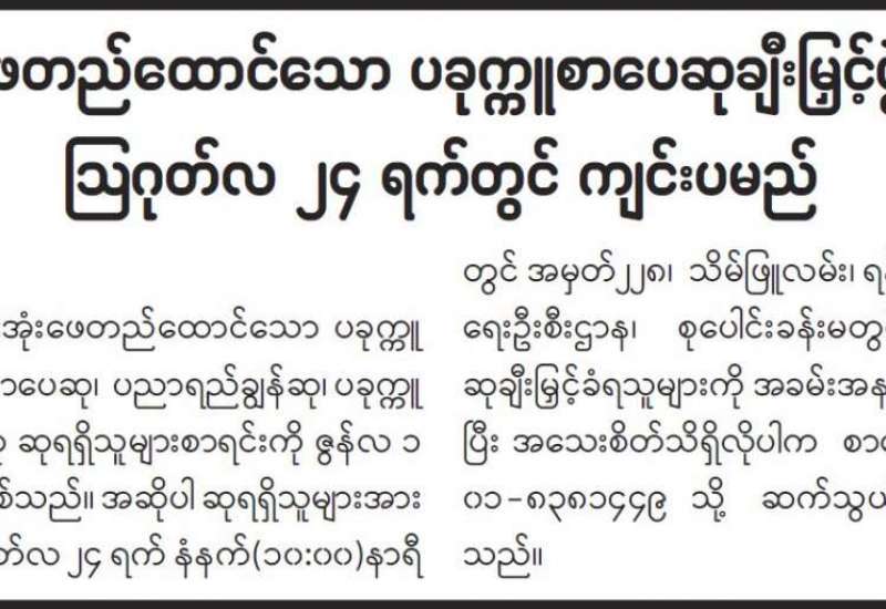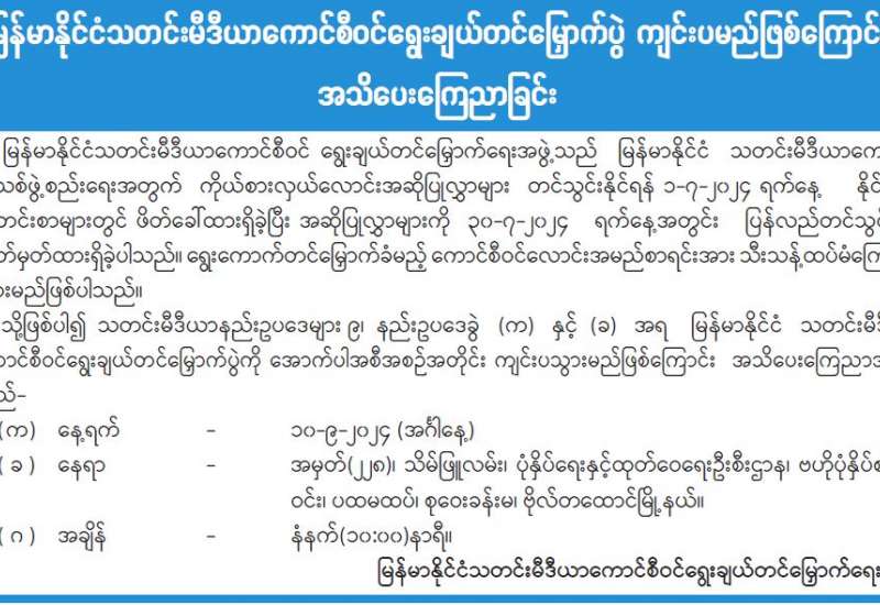 မြန်မာနိုင်ငံသတင်းမီဒီယာကောင်စီဝင်ရွေးချယ်တင်မြှောက်ပွဲ ကျင်းပမည်ဖြစ်ကြောင်း အသိပေးကြေညာခြင်း