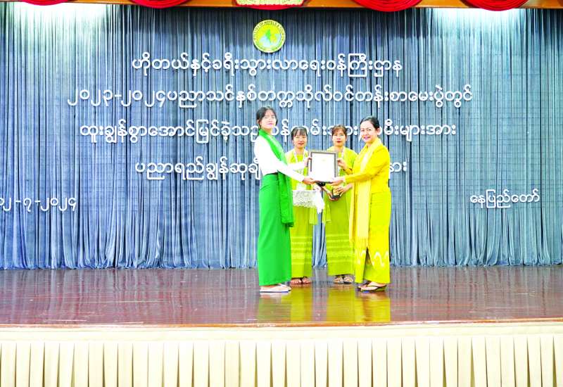 ဟိုတယ်နှင့် ခရီးသွားလာရေး ဝန်ကြီးဌာန ၂၀၂၃-၂၀၂၄ ပညာ သင်နှစ် တက္ကသိုလ်ဝင်စာမေးပွဲတွင် ထူးချွန်စွာအောင်မြင်ခဲ့သည့် ဝန်ထမ်းသားသမီးများအား ပညာရည်ချွန်ဆုချီးမြှင့်ခြင်း အခမ်းအနားကို ယနေ့မွန်းလွဲပိုင်းတွင် နေပြည်တော်ရှိ ဟိုတယ်နှင့်ခရီးသွားလာရေးဝန်ကြီးဌာန ကျောက်စိမ်းခန်းမ၌ ကျင်းပသည်။
