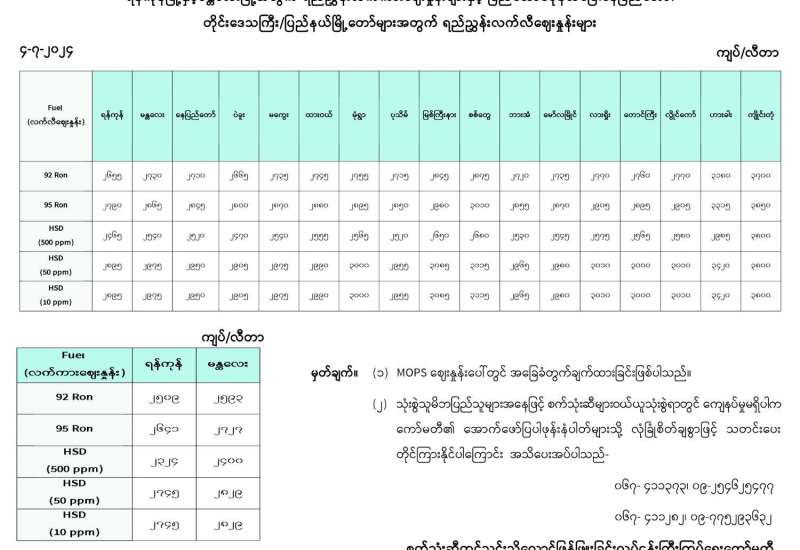 ရန်ကုန်မြို့နှင့် မန္တလေးမြို့အတွက် ရည်ညွှန်းလက်ကားဈေးနှုန်းများနှင့် ပြည်ထောင်စုနယ်မြေ နေပြည်တော်၊ တိုင်းဒေသကြီး/ပြည်နယ် မြို့တော်များအတွက် ရည်ညွှန်းလက်လီဈေးနှုန်းများ