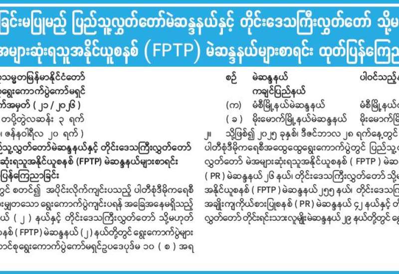 ရွေးကောက်ပွဲများ ကျင်းပခြင်းမပြုမည့် ပြည်သူ့လွှတ်တော်မဲဆန္ဒနယ်နှင့် တိုင်းဒေသကြီးလွှတ်တော် သို့မဟုတ် ပြည်နယ်လွှတ်တော် မဲအများဆုံးရသူအနိုင်ယူစနစ် (FPTP) မဲဆန္ဒနယ်များစာရင်း ထုတ်ပြန်ကြေညာ
