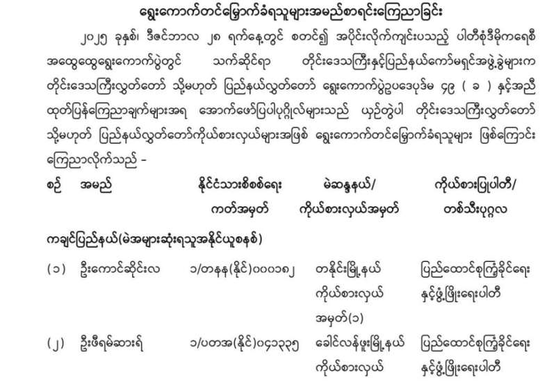 ပြည်ထောင်စုသမ္မတမြန်မာနိုင်ငံတော် ပြည်ထောင်စုရွေးကောက်ပွဲကော်မရှင် ကြေညာချက်အမှတ် (၉/၂၀၂၆) ၁၃၈၇ ခုနှစ်၊ ပြာသိုလပြည့်ကျော် ၄ ရက် (၂၀၂၆ ခုနှစ်၊ ဇန်နဝါရီလ ၆ ရက်) တိုင်းဒေသကြီးလွှတ်တော် သို့မဟုတ် ပြည်နယ်လွှတ်တော်ကိုယ်စားလှယ်အဖြစ် ရွေးကောက်တင်မြှောက်ခံရသူများအမည်စာရင်းကြေညာခြင်း