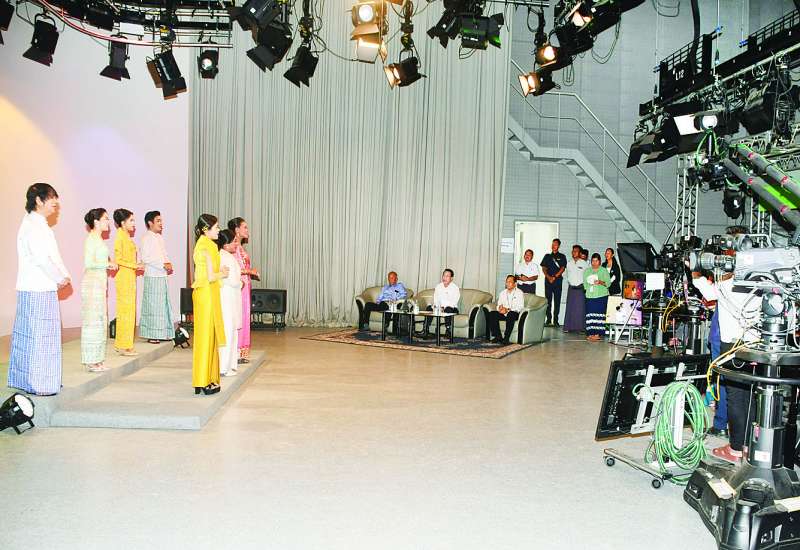 ပြန်ကြားရေးဝန်ကြီးဌာန ပြည်ထောင်စုဝန်ကြီး ဦးမောင်မောင်အုန်းသည် ယနေ့ညနေပိုင်းတွင် ရန်ကုန်မြို့ ပြည်လမ်းရှိ မြန်မာ့အသံနှင့်ရုပ်မြင်သံကြား၌ ၂၀၂၅ ခုနှစ် ပါတီစုံဒီမိုကရေစီအထွေထွေ ရွေးကောက်ပွဲကြီး အောင်မြင်စွာကျင်းပနိုင်ရန်အတွက် တိုင်းရင်းသားပြည်သူလူထုတစ်ရပ်လုံးက ဝိုင်းဝန်းကြိုးပမ်းဆောင်ရွက်နေမှုတွင် မြန်မာနိုင်ငံဂီတအစည်းအရုံး (ဗဟို) အစီအစဉ်ဖြင့် အသိပညာပေးနှိုးဆော်ရေး ရွေးကောက်ပွဲလှုံ့ဆော်တေး ရိုက်ကူးနေမှုကို ကြည့်ရှုအားပေးသည်။