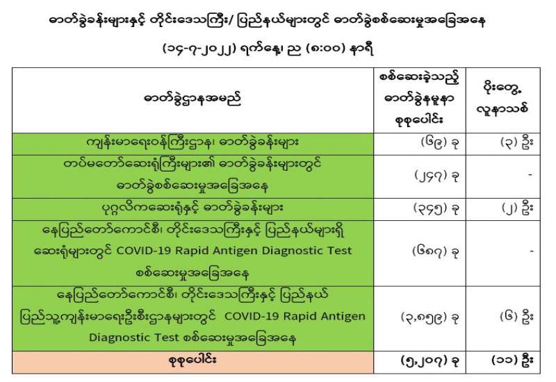 ကျန်းမာရေးဝန်ကြီးဌာနအနေဖြင့် နိုင်ငံအတွင်း ကူးစက်ဖြစ်ပွားနေသော COVID-19 ရောဂါ ကာကွယ်၊ ကုသ၊ ထိန်းချုပ်ရေးလုပ်ငန်းများကို အရှိန်အဟုန်မပြတ် ဆောင်ရွက်လျက်ရှိပါသည်။