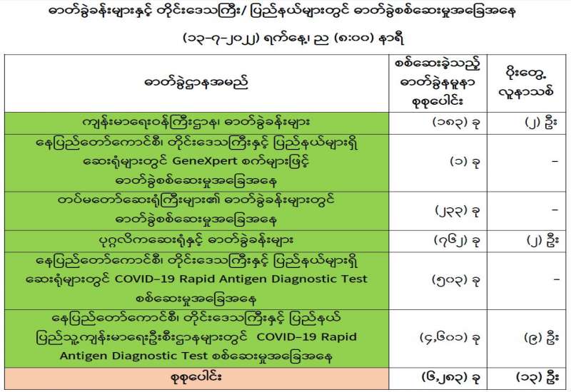 ကျန်းမာရေးဝန်ကြီးဌာနအနေဖြင့် နိုင်ငံအတွင်း ကူးစက်ဖြစ်ပွားနေသော COVID-19 ရောဂါ ကာကွယ်၊ ကုသ၊ ထိန်းချုပ်ရေးလုပ်ငန်းများကို အရှိန်အဟုန်မပြတ် ဆောင်ရွက်လျက်ရှိရာ ရောဂါ ထိန်းချုပ်ရေးလုပ်ငန်းများ အောင်မြင်နိုင်ရေးအတွက် ပြည်သူလူထုအနေဖြင့် ကျန်းမာရေးဝန်ကြီးဌာနမှ ထုတ်ပြန်ထားသော COVID-19 ရောဂါကာကွယ်ထိန်းချုပ်ရေးဆိုင်ရာ စည်းကမ်းများကို စနစ်တကျ လိုက်နာဆောင်ရွက်ရန် လိုအပ်ပြီး COVID-19 ကာကွယ်ဆေးထိုးနှံမှုခံယူခြင်းအား အထူးဂရုပြု ပူးပေါင်းဆောင်ရွက်ကြရန် လိုအပ်ပါသည်။