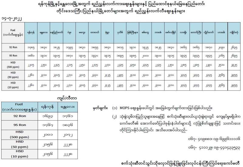 ရန်ကုန်မြို့နှင့်မန္တလေးမြို့အတွက် ရည်ညွှန်းလက်ကားဈေးနှုန်းများနှင့် ပြည်ထောင်စုနယ်မြေ၊ နေပြည်တော်၊ တိုင်းဒေသကြီး/ပြည်နယ်မြို့တော်များအတွက် ရည်ညွှန်းလက်လီဈေးနှုန်းများ