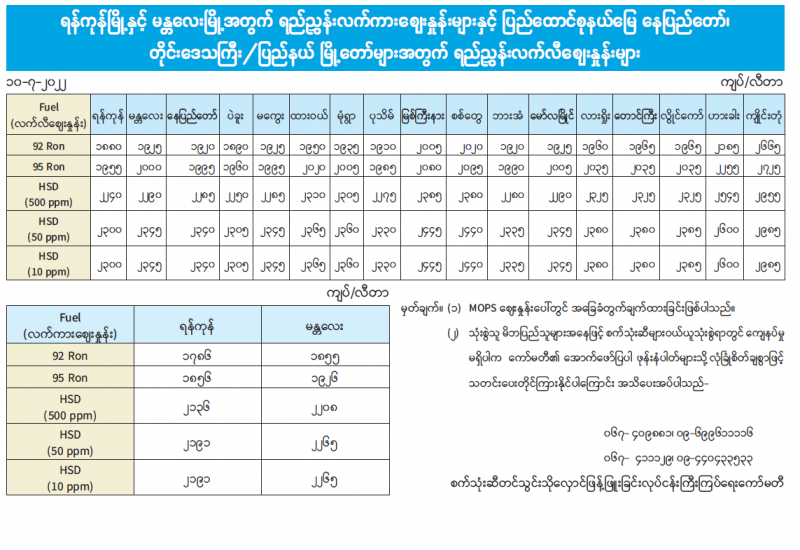 ရန်ကုန်မြို့နှင့် မန္တလေးမြို့အတွက် ရည်ညွှန်းလက်ကားဈေးနှုန်းများနှင့် ပြည်ထောင်စုနယ်မြေ နေပြည်တော်၊ တိုင်းဒေသကြီး/ပြည်နယ် မြို့တော်များအတွက် ရည်ညွှန်းလက်လီဈေးနှုန်းများ