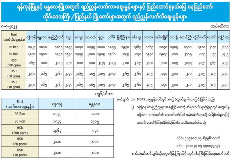ရန်ကုန်မြို့နှင့် မန္တလေးမြို့အတွက် ရည်ညွှန်းလက်ကားဈေးနှုန်းများနှင့် ပြည်ထောင်စုနယ်မြေ နေပြည်တော်၊ တိုင်းဒေသကြီး/ပြည်နယ် မြို့တော်များအတွက် ရည်ညွှန်းလက်လီဈေးနှုန်းများ