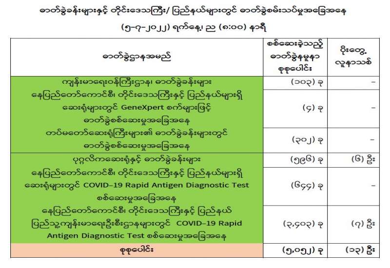 ကျန်းမာရေးဝန်ကြီးဌာနအနေဖြင့် နိုင်ငံအတွင်း ကူးစက်ဖြစ်ပွားနေသော COVID-19 ရောဂါ ကာကွယ်၊ ကုသ၊ ထိန်းချုပ်ရေးလုပ်ငန်းများကို အရှိန်အဟုန်မပြတ် ဆောင်ရွက်လျက်ရှိပါသည်။