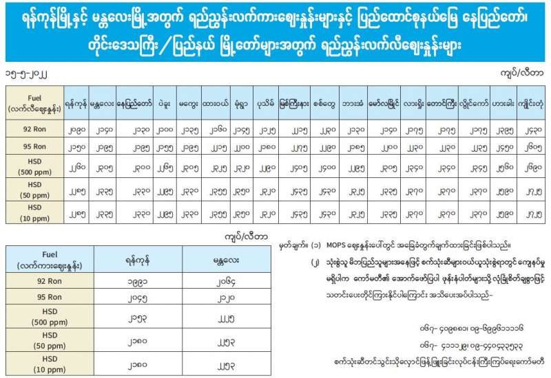 ရန်ကုန်မြို့နှင့် မန္တလေးမြို့အတွက် ရည်ညွှန်းလက်ကားဈေးနှုန်းများနှင့် ပြည်ထောင်စုနယ်မြေ နေပြည်တော်၊ တိုင်းဒေသကြီး/ပြည်နယ် မြို့တော်များအတွက် ရည်ညွှန်းလက်လီဈေးနှုန်းများ