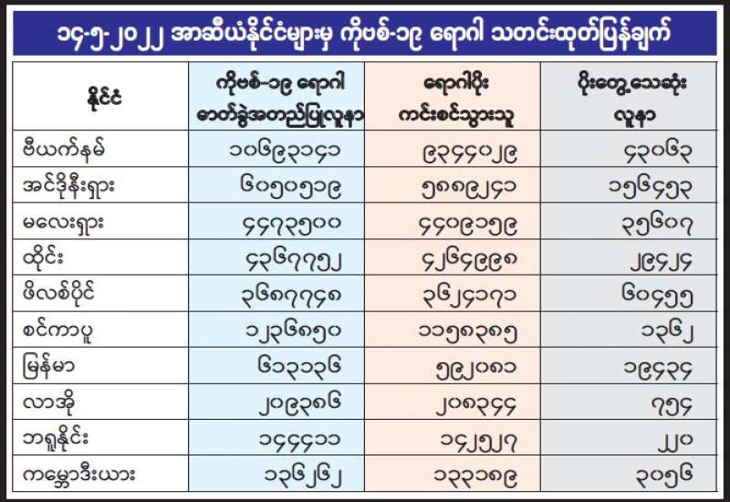 တိုင်းဒေသကြီးနှင့် ပြည်နယ်အသီးသီးတို့၌ သံဃာတော်များ၊ သာသနာ့နွယ်ဝင်သီလရှင်များ၊ ဘာသာရေး ခေါင်းဆောင်များအပါအဝင် လူမျိုးမရွေးဘာသာမရွေး အသက် ၄၀ အထက် ဒေသခံပြည်သူများ၊ အကျဉ်းသား အကျဉ်းသူများ၊ မသန်စွမ်းသူများ၊ တိုင်းရင်းသားလက်နက်ကိုင်အဖွဲ့များ၊ နာတာရှည်ရောဂါအခံရှိသူများ၊ ကယ်ဆယ်ရေးစခန်းများ၊ ယာယီတိုက်ပွဲရှောင်စခန်းများအတွင်းရှိ ပြည်သူများ၊ အသက် ၁၂ နှစ်အထက် အခြေခံပညာအလယ်တန်းနှင့် အထက်တန်းအဆင့် ကျောင်းသား ကျောင်းသူများစသည့် ဦးတည်အုပ်စုများ သတ်မှတ်၍ တပ်မတော်မှဆေးအဖွဲ့များ၊ ပြည်သူ့ဆေးရုံများမှ ဆရာဝန်များ၊ သူနာပြုများ၊ ကျန်းမာရေးဝန်ထမ်းများနှင့် စေတနာ့ဝန်ထမ်းများက ကာကွယ်ဆေးထိုးခြင်း လုပ်ငန်းများကို ဆောင်ရွက်ပေးလျက် ရှိသည်။