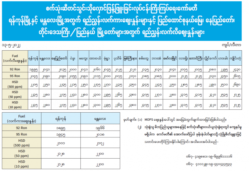 စက်သုံးဆီ တင်သွင်းသိုလှောင်ဖြန့်ဖြူးခြင်းလုပ်ငန်း ကြီးကြပ်ရေးကော်မတီ ရန်ကုန်မြို့နှင့် မန္တလေးမြို့အတွက် ရည်ညွှန်းလက်ကားဈေးနှုန်းများနှင့် ပြည်ထောင်စုနယ်မြေ၊ နေပြည်တော်၊ တိုင်းဒေသကြီး/ ပြည်နယ် မြို့တော်များအတွက် ရည်ညွှန်းလက်လီ ဈေးနှုန်းများ