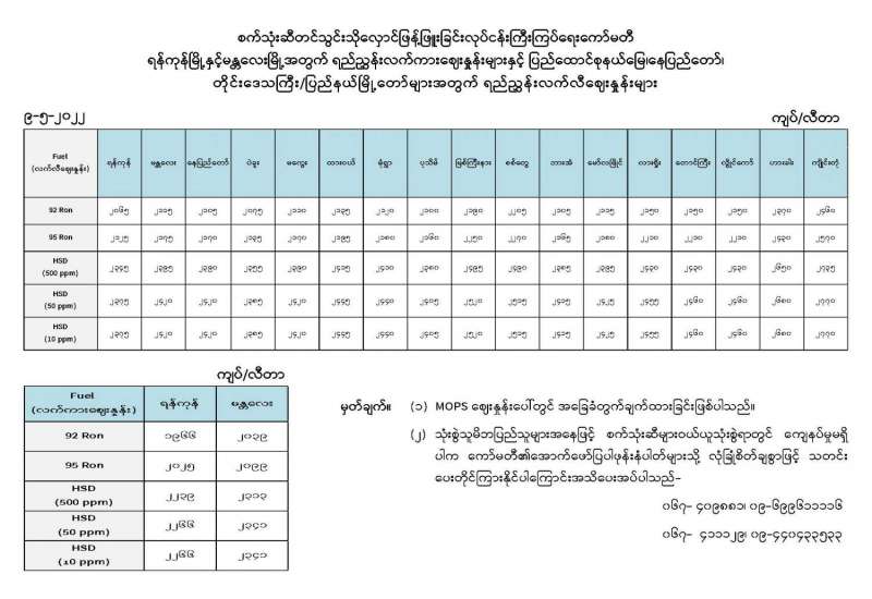 စက်သုံးဆီတင်သွင်းသိုလှောင်ဖြန့်ဖြူးခြင်းလုပ်ငန်းကြီးကြပ်ရေးကော်မတီ ရန်ကုန်မြို့နှင့်မန္တလေးမြို့အတွက် ရည်ညွှန်းလက်ကားဈေးနှုန်းများနှင့် ပြည်ထောင်စုနယ်မြေ၊ နေပြည်တော်၊ တိုင်းဒေသကြီး/ပြည်နယ်မြို့တော်များအတွက် ရည်ညွှန်းလက်လီဈေးနှုန်းများ