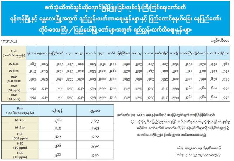 စက်သုံးဆီတင်သွင်း သိုလှောင်ဖြန့်ဖြူးခြင်းလုပ်ငန်း ကြီးကြပ်ရေးကော်မတီ ရန်ကုန်မြို့နှင့် မန္တလေးမြို့အတွက် ရည်ညွှန်းလက်ကားဈေးနှုန်းများနှင့် ပြည်ထောင်စုနယ်မြေ၊ နေပြည်တော်၊ တိုင်းဒေသကြီး/ ပြည်နယ်မြို့တော်များအတွက် ရည်ညွှန်းလက်လီ ဈေးနှုန်းများ