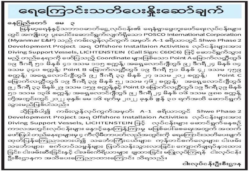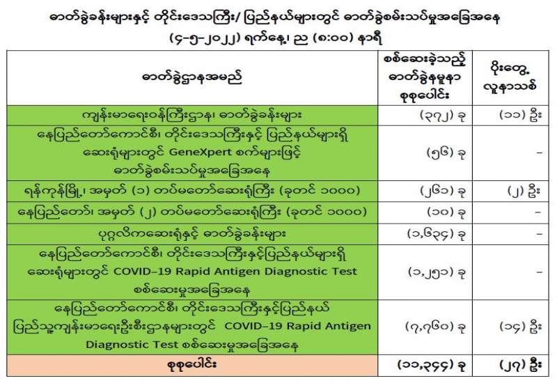 ကျန်းမာရေးဝန်ကြီးဌာနအနေဖြင့် နိုင်ငံအတွင်းကူးစက်ဖြစ်ပွားနေသော COVID-19 ရောဂါ ကာကွယ်၊ ကုသ၊ ထိန်းချုပ်ရေး လုပ်ငန်းများကို အရှိန်အဟုန်မြှင့်ဆောင်ရွက်လျက်ရှိရာ ရောဂါထိန်းချုပ်ရေးလုပ်ငန်းများ အောင်မြင်နိုင်ရေးအတွက် ပြည်သူလူထုအနေဖြင့် ကျန်းမာရေးဝန်ကြီးဌာနမှ ထုတ်ပြန်ထားသော COVID-19 ရောဂါ ကာကွယ်ထိန်းချုပ်ရေးဆိုင်ရာ စည်းကမ်းများကို စနစ်တကျ လိုက်နာဆောင်ရွက်ရန်လိုအပ်ပြီး COVID-19 ကာကွယ်ဆေးထိုးနှံမှုခံယူခြင်းအား အထူးဂရုပြု ပူးပေါင်းဆောင်ရွက်ကြရန် လိုအပ်ပါသည်။