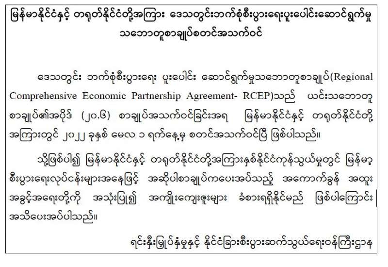 ကျန်းမာရေးဝန်ကြီးဌာနအနေဖြင့် နိုင်ငံအတွင်း ကူးစက်ဖြစ်ပွားနေသော COVID-19 ရောဂါ ကာကွယ်၊ ကုသ၊ ထိန်းချုပ်ရေးလုပ်ငန်းများကို အရှိန်အဟုန်မြှင့် ဆောင်ရွက်လျက်ရှိရာ ရောဂါ ထိန်းချုပ် ရေးလုပ်ငန်းများ အောင်မြင်နိုင်ရေးအတွက် ပြည်သူလူထုအနေဖြင့် ကျန်းမာရေး ဝန်ကြီးဌာနမှ ထုတ်ပြန်ထားသော COVID-19 ရောဂါ ကာကွယ်ထိန်းချုပ်ရေး ဆိုင်ရာ စည်းကမ်းများကို စနစ်တကျ လိုက်နာဆောင်ရွက်ရန် လိုအပ်ပြီး COVID-19 ကာကွယ်ဆေးထိုးနှံမှု ခံယူခြင်းအား အထူး ဂရုပြု ပူးပေါင်းဆောင်ရွက်ကြရန် လိုအပ်ပါသည်။
