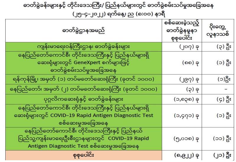 ကျန်းမာရေးဝန်ကြီးဌာနအနေဖြင့် နိုင်ငံအတွင်း ကူးစက်ဖြစ်ပွားနေသော COVID-19 ရောဂါ ကာကွယ်၊ ကုသ၊ ထိန်းချုပ်ရေးလုပ်ငန်းများကို အရှိန်အဟုန်မြှင့် ဆောင်ရွက်လျက်ရှိပါသည်။