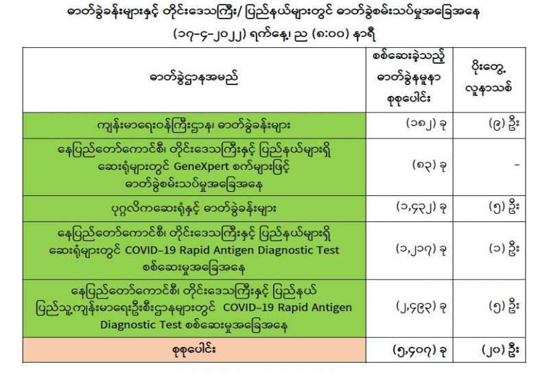 ကျန်းမာရေးဝန်ကြီးဌာနအနေဖြင့် နိုင်ငံအတွင်း ကူးစက်ဖြစ်ပွားနေသော COVID-19 ရောဂါ ကာကွယ်၊ ကုသ၊ ထိန်းချုပ်ရေးလုပ်ငန်းများကို အရှိန်အဟုန်မြှင့်ဆောင်ရွက်လျက်ရှိရာ ရောဂါထိန်းချုပ်ရေးလုပ်ငန်းများ အောင်မြင်နိုင်ရေးအတွက် ပြည်သူလူထုအနေဖြင့် ကျန်းမာရေးဝန်ကြီးဌာနမှ ထုတ်ပြန်ထားသော COVID-19 ရောဂါကာကွယ်ထိန်းချုပ်ရေးဆိုင်ရာ စည်းကမ်းများကို စနစ်တကျ လိုက်နာ ဆောင်ရွက်ရန် လိုအပ်ပြီး COVID-19 ကာကွယ်ဆေးထိုးနှံမှုခံယူခြင်းအား အထူးဂရုပြု ပူးပေါင်းဆောင်ရွက်ကြရန် လိုအပ်ပါသည်။