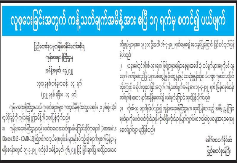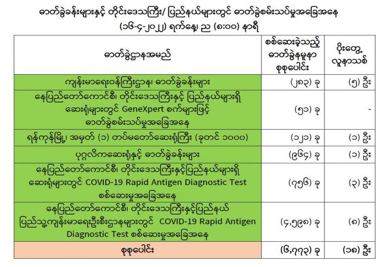 ကျန်းမာရေးဝန်ကြီးဌာနအနေဖြင့် နိုင်ငံအတွင်း ကူးစက်ဖြစ်ပွားနေသော COVID-19 ရောဂါ ကာကွယ်၊ ကုသ၊ ထိန်းချုပ်ရေးလုပ်ငန်းများကို အရှိန်အဟုန်မြှင့်ဆောင်ရွက်လျက်ရှိပါသည်။