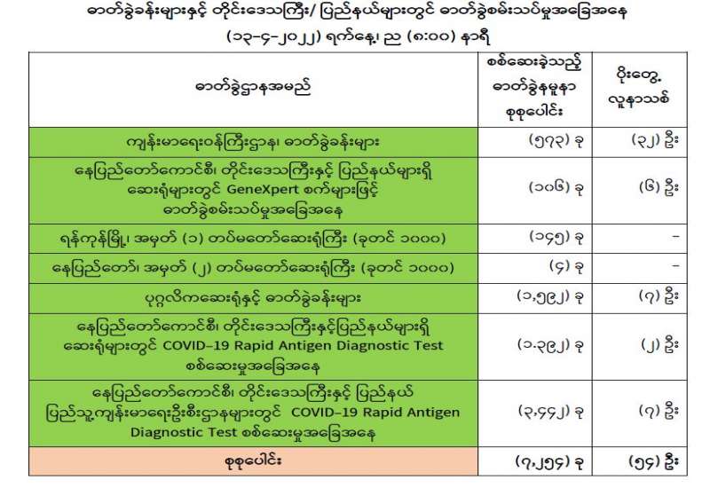ကျန်းမာရေးဝန်ကြီးဌာနအနေဖြင့် နိုင်ငံအတွင်း ကူးစက်ဖြစ်ပွားနေသော COVID-19 ရောဂါ ကာကွယ်၊ ကုသ၊ ထိန်းချုပ်ရေးလုပ်ငန်းများကို အရှိန်အဟုန်မြှင့်ဆောင်ရွက်လျက်ရှိရာ ရောဂါထိန်းချုပ်ရေးလုပ်ငန်းများ အောင်မြင်နိုင်ရေးအတွက် ပြည်သူလူထုအနေဖြင့် ကျန်းမာ ရေးဝန်ကြီးဌာနမှ ထုတ်ပြန်ထားသော COVID-19 ရောဂါကာကွယ်ထိန်းချုပ်ရေးဆိုင်ရာ စည်းကမ်းများကို စနစ်တကျလိုက်နာ ဆောင်ရွက်ရန်လိုအပ်ပြီး COVID-19 ကာကွယ်ဆေးထိုးနှံမှုခံယူခြင်းအား အထူးဂရုပြု ပူးပေါင်းဆောင်ရွက်ကြရန် လိုအပ်ပါသည်။