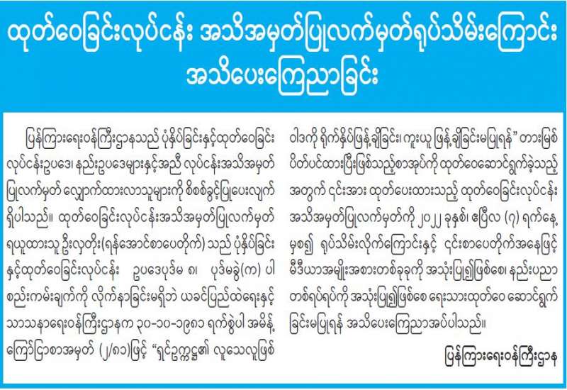 ထုတ်ဝေခြင်းလုပ်ငန်း အသိအမှတ်ပြုလက်မှတ်ရုပ်သိမ်းကြောင်း အသိပေးကြေညာခြင်း