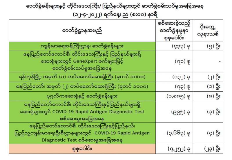ကျန်းမာရေးဝန်ကြီးဌာနအနေဖြင့် နိုင်ငံအတွင်း ကူးစက်ဖြစ်ပွားနေသော COVID-19 ရောဂါ ကာကွယ်၊ ကုသ၊ ထိန်းချုပ်ရေးလုပ်ငန်းများကို အရှိန်အဟုန်မြှင့်ဆောင်ရွက်လျက်ရှိပါသည်။
