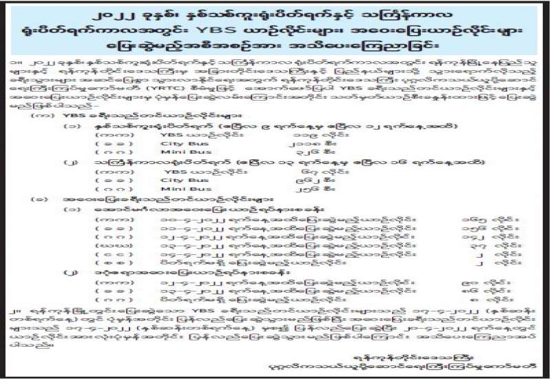 ၂၀၂၂ ခုနှစ်၊ နှစ်သစ်ကူးရုံးပိတ်ရက်နှင့် သင်္ကြန်ကာလ ရုံးပိတ်ရက်ကာလအတွင်း YBS ယာဉ်လိုင်းများ၊ အဝေးပြေးယာဉ်လိုင်းများ ပြေးဆွဲမည့်အစီအစဉ်အား အသိပေးကြေညာခြင်း