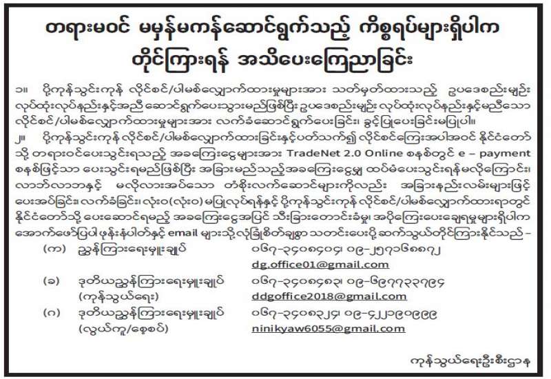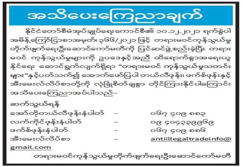 တရားမဝင်ကုန်သွယ်မှုတိုက်ဖျက်ရေး ဦးဆောင် ကော်မတီ၏ ကြီးကြပ်ကွပ်ကဲမှုဖြင့် တရားမဝင် ကုန်သွယ်မှုများကို ဥပဒေနှင့်အညီ ထိရောက်စွာ တားဆီးအရေးယူနိုင်ရေး ဆောင်ရွက်လျက်ရှိရာ ဧပြီ ၉ ရက်တွင် အကောက်ခွန်ဦးစီးဌာန၏ စီမံခန့်ခွဲမှုဖြင့် မြန်မာစက်မှုဆိပ်ကမ်း ကုန်သေတ္တာစစ်ဆေးရေးစခန်း၌ ဆိပ်ကမ်းတာဝန်ကျ အကောက်ခွန် စစ်ဆေးရေးအဖွဲ့က စစ်ဆေးမှုများ ဆောင်ရွက်ခဲ့ရာ သွင်းကုန်ကြေညာလွှာ ID တွင် ကြေညာထားခြင်းမရှိသော အလှကုန်ပစ္စည်းများ၊ ဖုန်းနှင့်ကွန်ပျူတာ အပိုပစ္စည်းများ၊ မော်တော်ယာဉ်အပိုပစ္စည်းများ၊ အိမ်သုံးလျှပ်စစ်ပစ္စည်းများနှင့် လုပ်ငန်းသုံးစက်ကိရိယာပစ္စည်းများ (ခန့်မှန်းတန်ဖိုးငွေကျပ် ၅၇၃၆၄၇၅၀၀) ကို ဖမ်းဆီးရမိခဲ့ပြီး အကောက်ခွန်ဥပဒေနှင့်အညီ အရေးယူ ဆောင်ရွက်လျက် ရှိသည်။