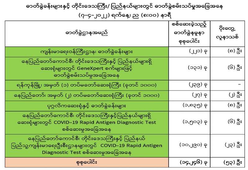 (၆-၄-၂၀၂၂) ရက်နေ့၊ ည (၈:၀၀) နာရီမှ (၇-၄-၂၀၂၂) ရက်နေ့၊ ည (၈:၀၀) နာရီအတွင်း ဓာတ်ခွဲနမူနာစုစုပေါင်း (၁၄,၂၄၆) ခုအား စစ်ဆေးပြီးစီးခဲ့ရာ COVID-19 ရောဂါ ဓာတ်ခွဲအတည်ပြု လူနာသစ် (၅၃) ဦး တွေ့ရှိရပါသည်။ ထို့ကြောင့် ယနေ့အတွက် ရောဂါပိုး တွေ့ရှိမှု ရာခိုင်နှုန်းမှာ (၀.၃၇) ရာခိုင်နှုန်း ရှိပါသည်။