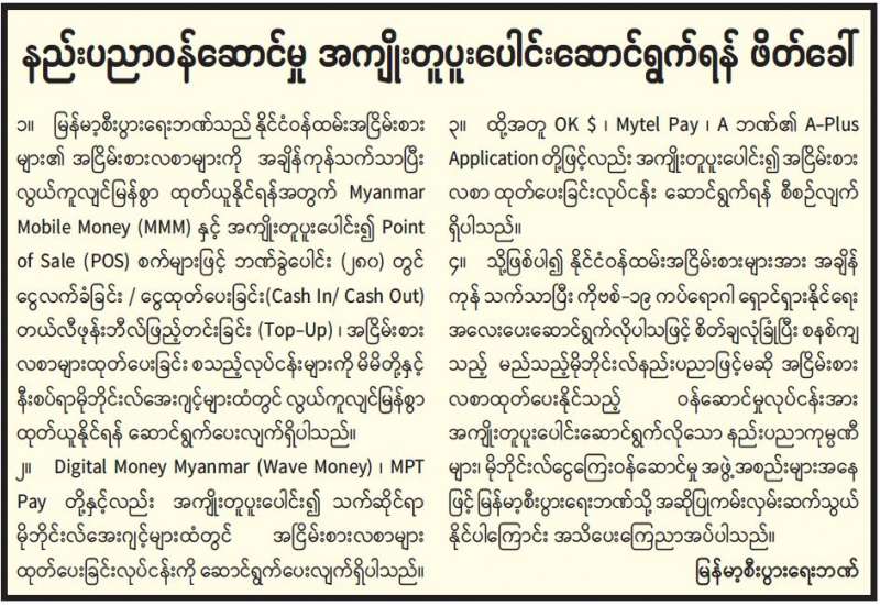 မြန်မာနိုင်ငံတွင် ကိုဗစ်-၁၉ ရောဂါ ကူးစက်ပျံ့နှံ့မှု အခြေအနေမှာ နေ့စဉ်ဓာတ်ခွဲစမ်းသပ်မှုများမှ ပိုးတွေ့လူနာသစ်တွေ့ရှိမှု (၁) ရာခိုင်နှုန်းအောက်သို့ ရောက်ရှိလာနေသည်ကို တွေ့ရသည်။ ကိုဗစ်-၁၉ ရောဂါကို အတိုင်းအတာတစ်ရပ်အထိ ထိန်းချုပ်နိုင်ပြီ ဖြစ်သည့်အလျောက် လာမည့်သင်္ကြန်ပွဲတော်ကို တိုင်းဒေသကြီးနှင့် ပြည်နယ်များအလိုက် ကျင်းပရန် ခွင့်ပြုထားပြီးဖြစ်သကဲ့သို့ သင်္ကြန်အပြီး နှစ်ဆန်းတစ်ရက်(ဧပြီ ၁၇ ရက်)မှစ၍ ရုပ်ရှင်ရုံများ ပြန်လည်ဖွင့်လှစ်ပြသနိုင်ရန်၊ ပြည်တွင်းပြည်ပခရီးသွားလာမှုများကို ခွင့်ပြုသွားရန်တို့အတွက်လည်း စီစဉ်ဆောင်ရွက်လျက်ရှိသည်။